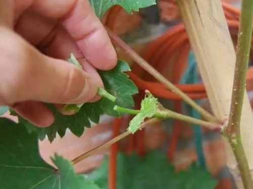 4、当枝条长到5、6片叶后,再次摘心,处理方法同前面,去掉最上部夏芽,其它节位夏芽留一叶反复摘心,盆栽葡萄叶片小,节间短,因此其它节位夏芽留一叶增加营养面积;