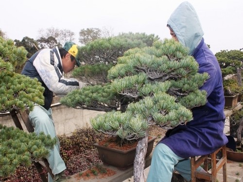 对已造型的五针松,为了保持其固有的造型姿态,需要每年摘芽、修剪,以控制枝叶生长,达到枝叶疏密适度、苍劲碧翠之态。
