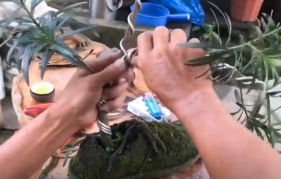 简单地说,就是在罗汉松木本旁边栽种上一株粗细与坏死枝干相同或相近的小苗,然后将小苗的主干弯曲,让其与坏死的枝干保持一致,再将两者紧紧捆扎起来,然后给两者钉上钉子以固定。一般养上一段时间之后,坏死枝干靠近主干一侧没有坏死的部分会与其捆扎在一起的小苗树干融为一体。