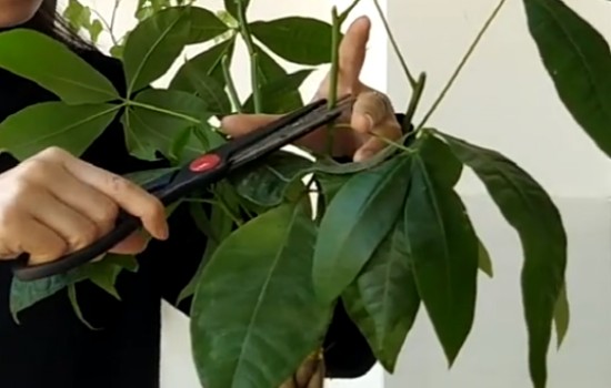 首先我们需要将发财树的侧枝朝外侧扒开,找到其中的主要生长点。然后沿着生长点上部0.5公分的地方,用经过消毒处理的剪刀将上部给它剪下来。发财树的这个枝条失去了生长点之后,就不会继续向上生长了,而这个枝条也不会再长出新枝。因为它的生长点失去之后,就被分散到了侧面的枝条上。