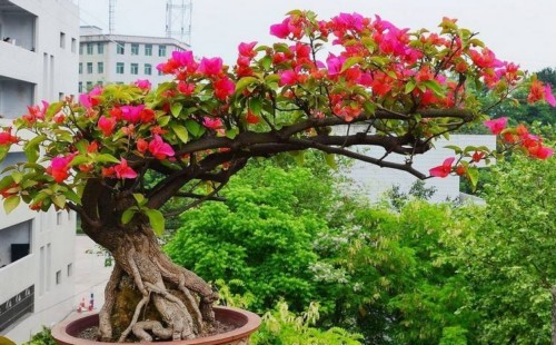 对于成树三角梅的造型,我们需要提前构思好总体的株型轮廓,而在施以造型手段时,要做到心中有数,从容而不盲目,最后才下手,通常是先施以修剪手段,再辅之蟠扎措施。而蟠扎往往是对修剪之后剩下的枝条进行处理,而且随着时间的推移,如果是通过靠接繁育的植株,在靠接部位的下方会逐渐形成新的树干,而其表层树皮会显得粗糙、凹凸,这样可增加三角梅的的苍劲古朴之感,从而更具观赏性。