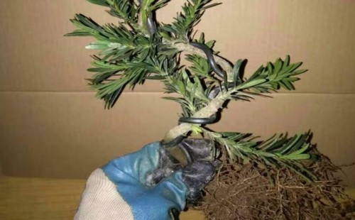 在初次给罗汉松小苗造型时,一般以打造主干形态为主,而且适合采取蟠扎手段,很少使用修剪手段。而对罗汉松小苗的定干处理,主要是对主干进行弯曲造型处理的过程。而用到的蟠扎工具主要是带柔软塑料外皮的金属丝,当然也可以使用电线丝之类的捆扎工具。