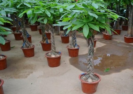发财树最重要的一个观赏价值就是可以进行艺术造型,辫子造型比较常见,即可用3-5株幼苗在同一盆中生长,待茎干长高后将其编成辫子。目前市售的发财树都是3-5株编成辫子,发育成三龙造型或五龙造型。这些辫子茎干是怎样编出的呢?