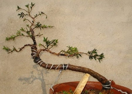 1、主干造型:为了主干弯曲的效果,可以立柱培养斜干、曲干。利用金属丝、螺杆等工具和刻伤扭曲等措施对主干造型,将主干压弯、倾斜。造型罗汉松的高度一般控制在1.5米至3.5米,造型原则是因树造型。