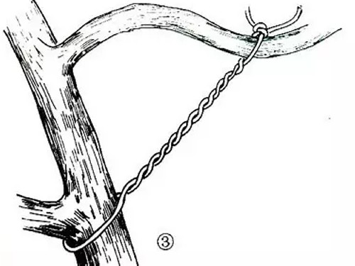如果怕金属线陷到枝条的表皮中,可先用牛皮纸、棉布、塑料制成带状,将金属丝包缠起来,必要时也可将攀扎的树干也包缠起来