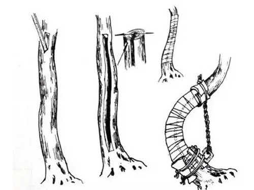 当枝条较粗大时,强行向下弯曲可能会造成折断,因此,可在枝条下方锯开一列切口,用塑料条包扎后再用棕丝进行捆扎。