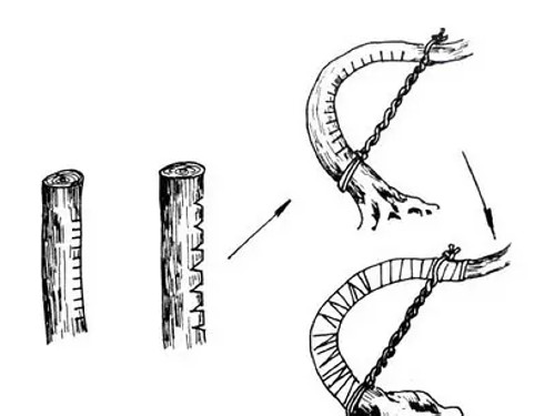 用棕丝进行捆扎方法:向下弯曲(3)。利用金属钩做为主干的固定点。