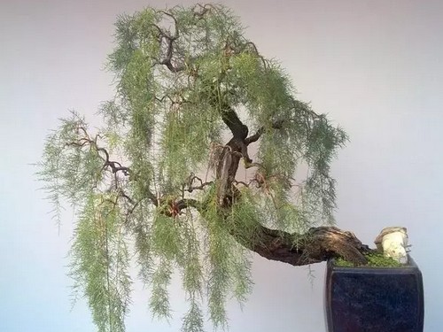 柽柳不仅树皮似松柏树枝,而且叶也近似其叶。仿松柏造型,首先要选树干挺拔,苍劲大气者。然后注重培育平伸枝或斜飘枝,主枝近干处适当留长不做叶片,以示其苍老,使其骨架近似于松柏骨架。最后是叶片制作,每片高低错落,片中有片,朵中有朵,力争近似松柏的叶片。