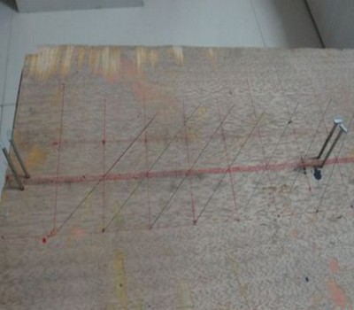 将最粗的铁丝用锤子打制直,放到模板上,用锯子锯上嵌槽。制作直径较小的花架时,采用三根立柱,当制作较大的花架时,建议采用四根立柱,或者更多。下图中,四个钉子可以把立柱夹在中间,防止立柱滚动,起到定位的作用。红色粗线部分用来放置立柱铁丝,黑色斜线是锯路方向,这样立柱上的嵌槽与立柱成45度角,捆扎时毛丝正好嵌进嵌槽,能够牢牢地把立柱与螺旋架捆在一起。也可以沿红色单实线直接锯割,这样嵌槽与立柱呈垂直状态,捆扎后也比较牢固。两个嵌槽之间间隔距离就是两层螺旋体之间的距离,本人定为3厘米,花友可根据实际情况自行扩缩。