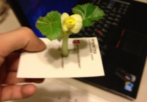 3、从母株上剪取一枝丽格海棠的健壮茎枝,然后将其穿插过硬壳纸中间的孔。操作时注意,不要将茎枝的给弄伤了,否则会影响其成活。