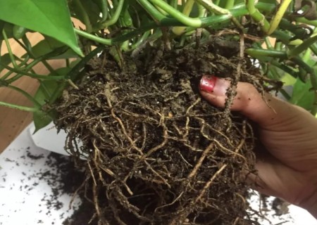 用手轻轻扒开绿萝基部的土壤,轻轻放在手上掂一掂,土质非常疏松,用手掰几下,再抖动几下,绿萝基部粘附的松软土壤就散落下来了。可见,绿萝的根系非常密集,不仅根须好,土壤也不错。
