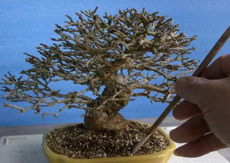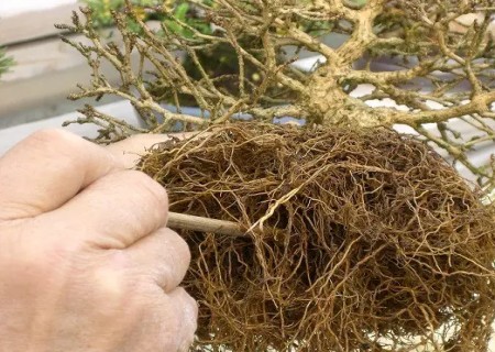 2、在将盆景植物土盆之后,我们就应当及时为其剔除多余的旧土,可以使用小木棒将根系中的多余土壤轻轻敲掉。