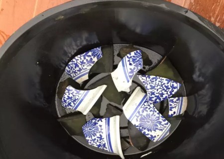 接着开始处理盆内防水层。我所有的防水层都这么做,包括铁线莲。首先你的找一个陶盆、瓦片什么的,要求就一句话:坚挺如老湿。这样它才支撑整个盆土的重量,可以轻松解决盆内积水问题。