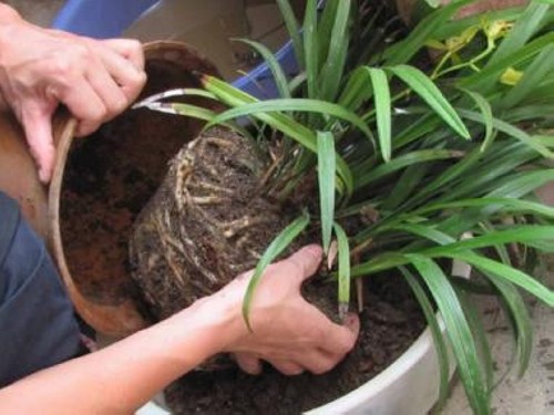 将兰盆倾倒,左手转动兰盆,右手拍打盆壁,使盆中植料松动,植料自然会从盆中不断出来,即可取出兰苗。个别盆中兰草较旺、根系繁多、紧贴盆壁生长,虽经反复拍打,亦不易松动,要耐心地拍打,亦可用木棍从底部的泄水孔往上顶,一般均能顺利取出来。实在无奈,只好破盆取苗。