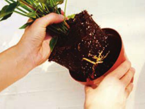 1、选一盆株型优美且开花的红掌,轻轻拍打盆的四周,脱去换盆。