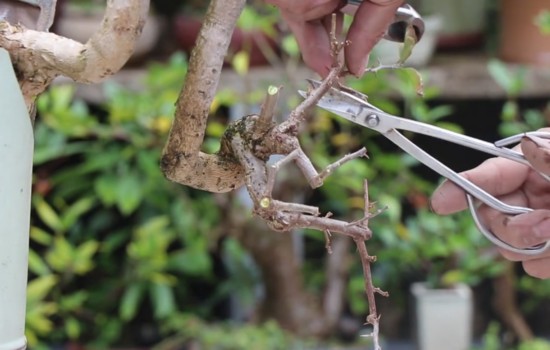 修枝时需要注意的是,临水式或悬崖式盆景飘枝上一般需要让枝条保持合适的角度,对于阻碍角度和观赏的多余枝条,要及时剪掉。尤其是像三角梅这样的植株,飘枝上的枝条要尽量短截一下,正确调整或保留枝条合适的角度,让飘枝布局更加合理。