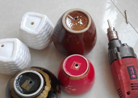 3、之后,就得在酒瓶子的最下面钻一个口子,用来排水的。步骤使用电转,在酒瓶子下面钻一个洞。