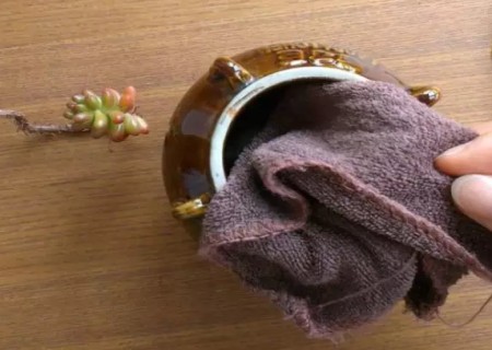 第二步:制作瓦罐透水孔。将准备好的湿抹布塞到瓦罐内,塞满,防止敲击的时候瓦罐炸裂;将瓦罐翻过来,在底部中间位置慢慢敲击,一定要控制好力度;这样瓦罐花盆就做好了。