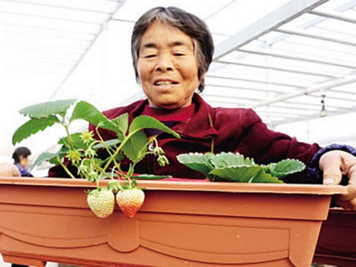 昨天上午,海丰农场专业合作社社员徐培英展示他们种植的草莓盆景。该合作社利用育秧大棚种植了3000余盆草莓盆景,目前,盆景内的草莓已开始开花结果,整个大棚散发着淡淡的甜香味。据介绍,一盆草莓盆景能结2斤草莓,当作盆景出售,可以卖到80元左右。