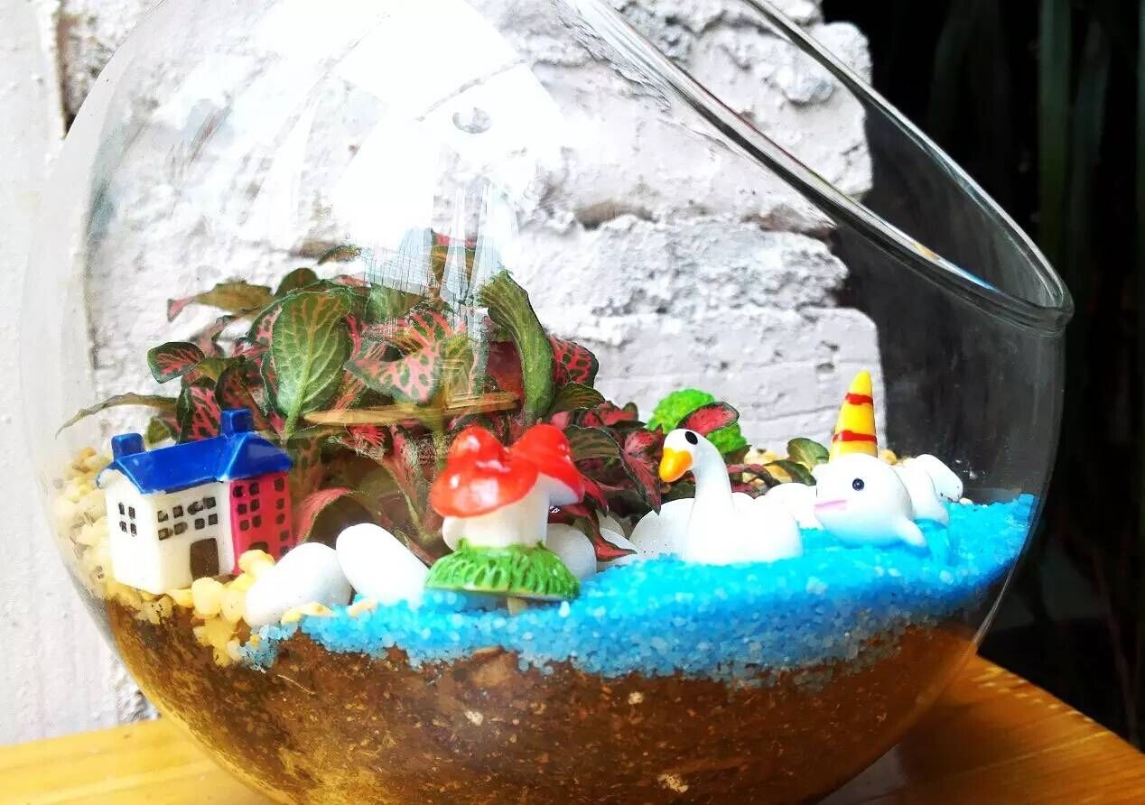 在一个透明的玻璃缸里面,或是陶瓷花瓶、铁艺花瓶,种上蕨类植物、多肉植物,搭配沙、石、木头、青苔,加上各种可爱的饰物,创作一个温馨的场景,一个个美丽而清新的生态微景观就展现在我们面前。