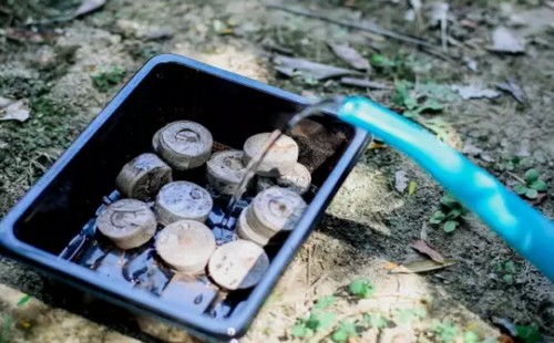 1、将准备好的育苗块放在一个一个大塑料箱子内,然后注入清水将育苗块浸泡一会儿,直到育苗块被彻底浸透后方可使用。