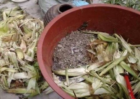 3、取一些有机物,比如像鸡粪这样类家禽粪便,放入盆内;然后再往盆内加入一些玉米苞叶,这样做的目的是为了沤制出原生态肥料,为植株提供养分打好基础。