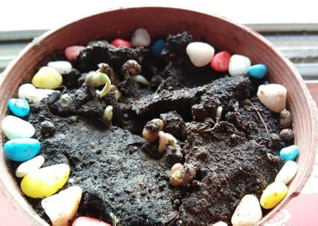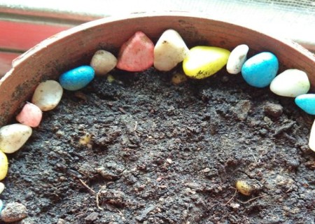 2、小盆里放入适量营养土,取适当豆芽放入盆内,再盖一层薄薄的土,周围摆上小彩石,等待发芽。