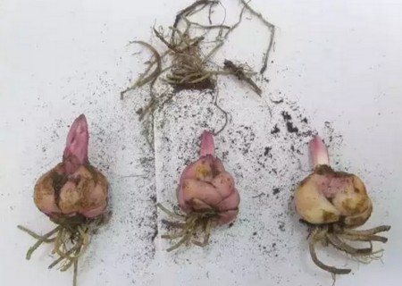 修剪种球底生根:将种球下面不好的根系修剪一下,有烂根或是不好的根系剪掉!注意只修剪不好的根!
