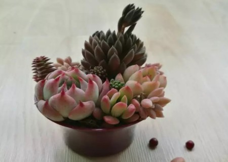 第2步:挑出3个花头大一些当主花,颜色不要太靠的摆到器皿里,空余部份摆辅花挑选花头小的,摆满即可,滇石莲颜色重,所以选器皿颜色要深一些,装饰品选择红豆是因为颜色可以和器皿相呼应。
