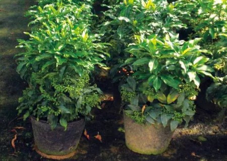 朱砂根播种育苗可于10~12月果实鲜红坚硬时采收,将果实置于清水中搓去果皮,捞出,直接在浅盆上播种。覆土后在盆面上盖玻璃或塑料薄膜,以减少水分蒸发。保持土壤湿润,温度控制在18~24℃之间,约20天左右即可生根出苗,发芽率可达85%以上。当幼苗有3片真叶时,停水蹲苗数天,即可起苗上盆。播种苗两年即能开花结果。