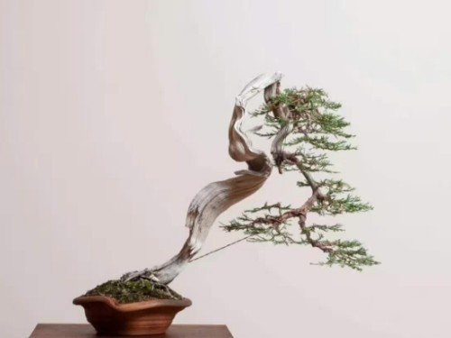 崖柏景桩成活后,至少要经过一两年甚至更长时间的精心养护,将顶枝养旺,侧枝养壮,叶片养胖,蓄枝养根使其茂盛,方可蟠扎牵拉。崖柏制景务必尊重崖柏的树性,大都主干扭曲有劲、古拙奇特、根出四歧,入地有性、叶态团簇、树冠或似云朵凝雨,或似峰峦叠翠,多为三角形和不等边三角形。