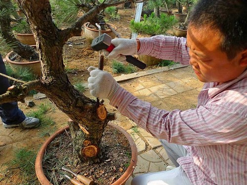 采掘后的松桩一般宜用紫砂陶盆。上盆前,先剔除山土二分之一左右,剪去枯根烂根,剪短部分长根,同时剪去过多的枝干、松针以减少受伤根系的负担。最好在采掘时,多挖些当地山土,有利于黑松对土壤的适应。