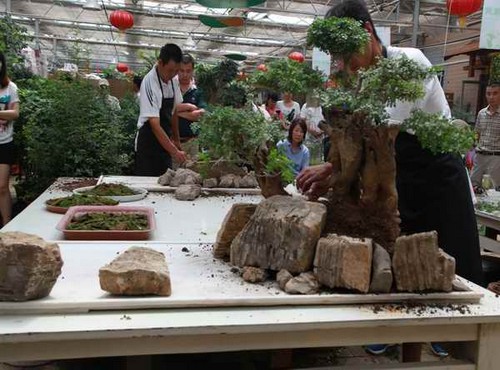 树石组合盆景是用多株树进行组合造景,并配合之以山石、草类、亭台楼船、人物鸟兽,形成千姿百态,极富诗情画意的盆景景观。这类盆景是以树桩(多株)组合 为主,同时又配合之石材及其他素材构成景观,因此应称为“树石组合类”盆景,它是以三株以上的树桩进行组合,并配合之石材及摆件具有一定空间范围的盆景造 型景观,其造型素材以树桩和石材为主。