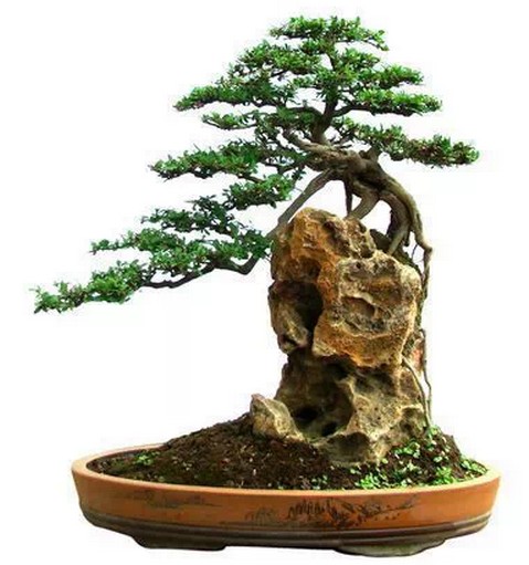 在山水盆景中,为了达到小中见大的效果,树木一般不能种植于山头,而在附石盆景中,有时为了渲染某一部分的魅力,完全可以把树木凌驾于山头之上,而山石反居次要地位。