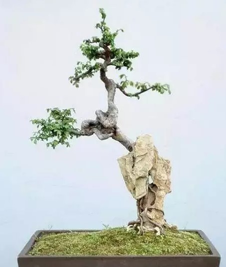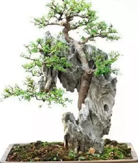 盆景中树木依附在石头上生长,将根系伸人石缝而生,枝干盘曲伸人石洞或石上丛生,或悬垂石下,或横斜傍石,使奇石与古树相映成趣。