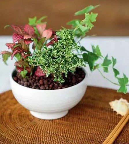 3、按照主次,依次将红网纹、常青藤和六月雪种到碗中。调整好位置后将土轻轻压实,最后填入陶粒增加美观性。