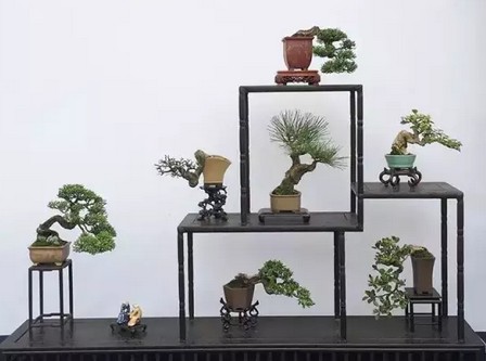 微型盆景固然优美动人,但终因体态娇小,不够引人注目,故常常为其配上小巧精致的红木几架或树根式花架,有如模特儿登上“T”型台,姿容耀眼,光彩照人。微型盆景多采用组合形式陈设布?,简单的组合,可采用高低式花架,放?数件微型盆景,互相呼应,相映成趣。更多的时候,是将多件微型盆景放置于博古架上,共同组成一幅美观的画面。放在同一博古架上的盆景,树种、石种、姿态、形式等应有变化,并能相互映衬,相得益彰。以博古架陈设盆景,一般每格摆放一件。盆景在格内既不能顶天立地,也不能太空。顶天立地会产生拥塞感,过空则显得渺小无物。为了打破色彩的单调和增添情趣,可配上小摆件一二,如陶瓷的花瓶、人物、动物等,有助于渲染气氛,丰富内容。锊如,在博古架上点缀精巧的玉香炉、瓷水盂、线装书等,无疑会洋溢书香气息;如果点缀人物、供石,又会增添古朴、典雅的气氛。—件博古架有时也专门陈设某一类盆??,形成一个专题,博古架的式样多种多样,可根据自己的需要自行设计。