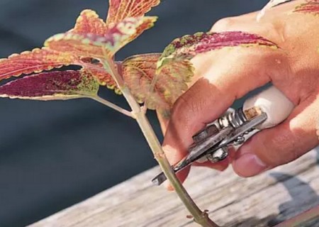 当彩叶草主枝或经过摘心的侧枝长有4个节或长10厘米左右时,挑选茎干粗壮者,基部仅留1节至2节的对生叶片,将上部剪下,剪口要平滑,没有挤压撕裂的伤口。然后,将插穗最下部的一对叶片剪掉,并且每3个至5个插穗集中整齐基部,用白线松束在一起,待为水插。