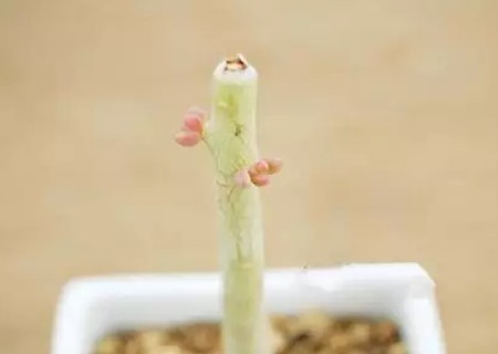 3、只要为母株提供适宜的光照,几天之后就能发现切口下方会慢慢长出一些红润的肉肉新芽了。等这些新芽长大之后就会变成和以前一样的黄绿色状态了。