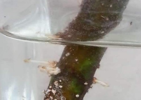2、经过2-3天之后可以发现,采用水培的方式繁殖的插枝基部已经泛起了一些白点,而土插的枝条还并没有明显变化。