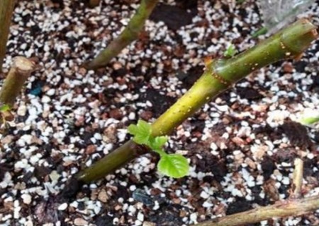 3、又过了数天,水培插枝上的白点更为突出了,叶芽也开始泛绿,这时为容器中滴入2滴营养液。但此时土插的枝条已经开始萌芽了。