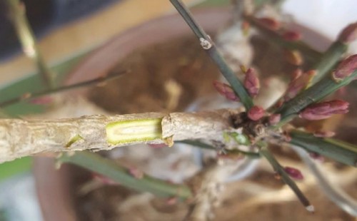 迎春花盆景怎么嫁接呢?除了可以剪切多年生枝条制作接穗进行腹接之外,我们也还可以采取芽接的方式来完成嫁接活动,甚至还可以同时使用多种手段来完成健壮枝的嫁接。下面是嫁接的过程。现在图示给大家: