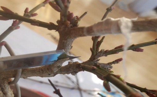 五、当然,还有一种比较少用的嫁接手段,即剪取当年生枝条进行嵌芽接的方式来完成嫁接。