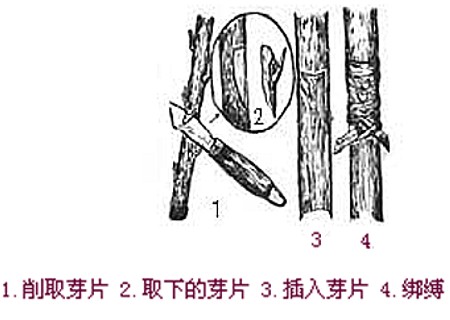 接实际上是一种接穗短缩了的皮下腹接,用于大枝干光秃部位生枝。大树离皮就能嫁接。嫁接时,先把要接部位的老皮刮掉,露出白皮,先切一“T”字形切口,在接穗上要留芽子的背面削一长4厘米左右的斜面,另一面的先端削2个小箭头。手持削好的接穗插入“T”字形切口内,待芽距“T”字形横切口1厘米左右时,用切接刀对准横切口一刀切下,将接穗切断,带木质的芽即进入“T”字形皮内。然后用塑料条捆紧。