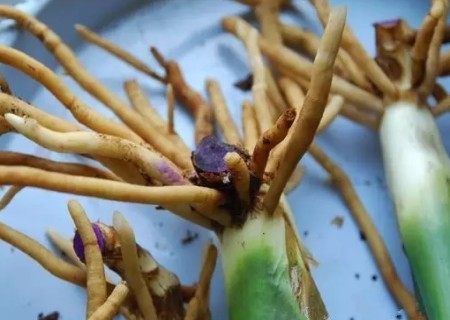 3)按照高锰酸钾:水=1:3000的比例配置高锰酸钾溶液,把君子兰根系泡在溶液中5-10分钟,之后再用清水洗净。