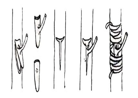 用塑料条捆扎。先在芽上方扎紧一道,再在芽下方捆紧一道,然后连缠三四下,系活扣。注意露出叶柄,露芽不露芽均可。