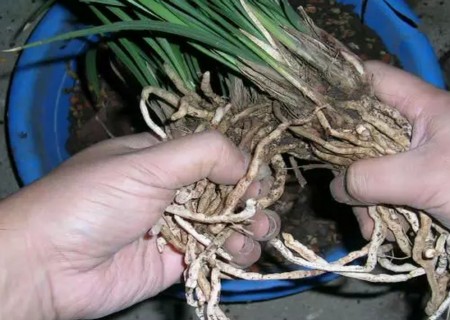 ①首先,将君子兰母株从盆中取出,除去根部的土壤,仔细观察可以分株根系。君子兰是肉质根,一条根养活一片叶。