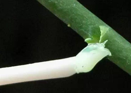 3、嫁接位置要适当。用量天尺作砧木时,量天尺宜种植在20厘米的花盆内,在高出盆面30厘米处横切,嫁接时用利刀在量天尺的3个棱角处向下各切1刀,切口都要深及髓部,然后取蟹爪兰植株顶部茎片2~3节,用利刀削去下端向上凸起的主脉和两面外皮,削成鸭嘴形,使维管束外露,切口要平滑,然后立即插入砧木切口至木质部为止,两者接合后立即用手捏住两者的接合部,用木夹子夹住或用针、刺固定,防止接穗滑出。按照此方式可在3个棱角处各接上1个接穗。