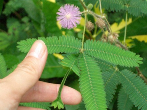 含羞草 多年生草本豆科植物,高约20厘米~60厘米,分枝多,遍体散生倒刺毛和锐刺。由于其独特的习性有着众多的别名昵称,如见笑草、感应草、喝呼草、知羞草、怕丑草、怕羞草和夫妻草等。由于这种植物生长力顽强,所以在不少国家,含羞草都被当成是一种野草。