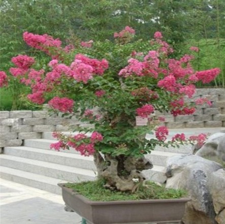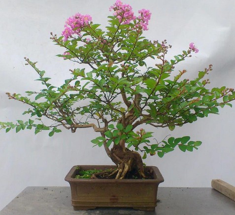 紫薇盆景施肥,主要在冬季施足有基肥,生长期每周左右,要施一次饼液肥及其它无磷钾机肥,现蕾前后期,可用0.2%磷酸二氢钾溶液进行叶面喷施,以促进花芽分化和花蕾膨大。